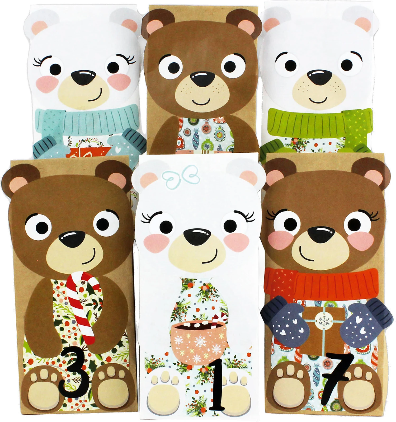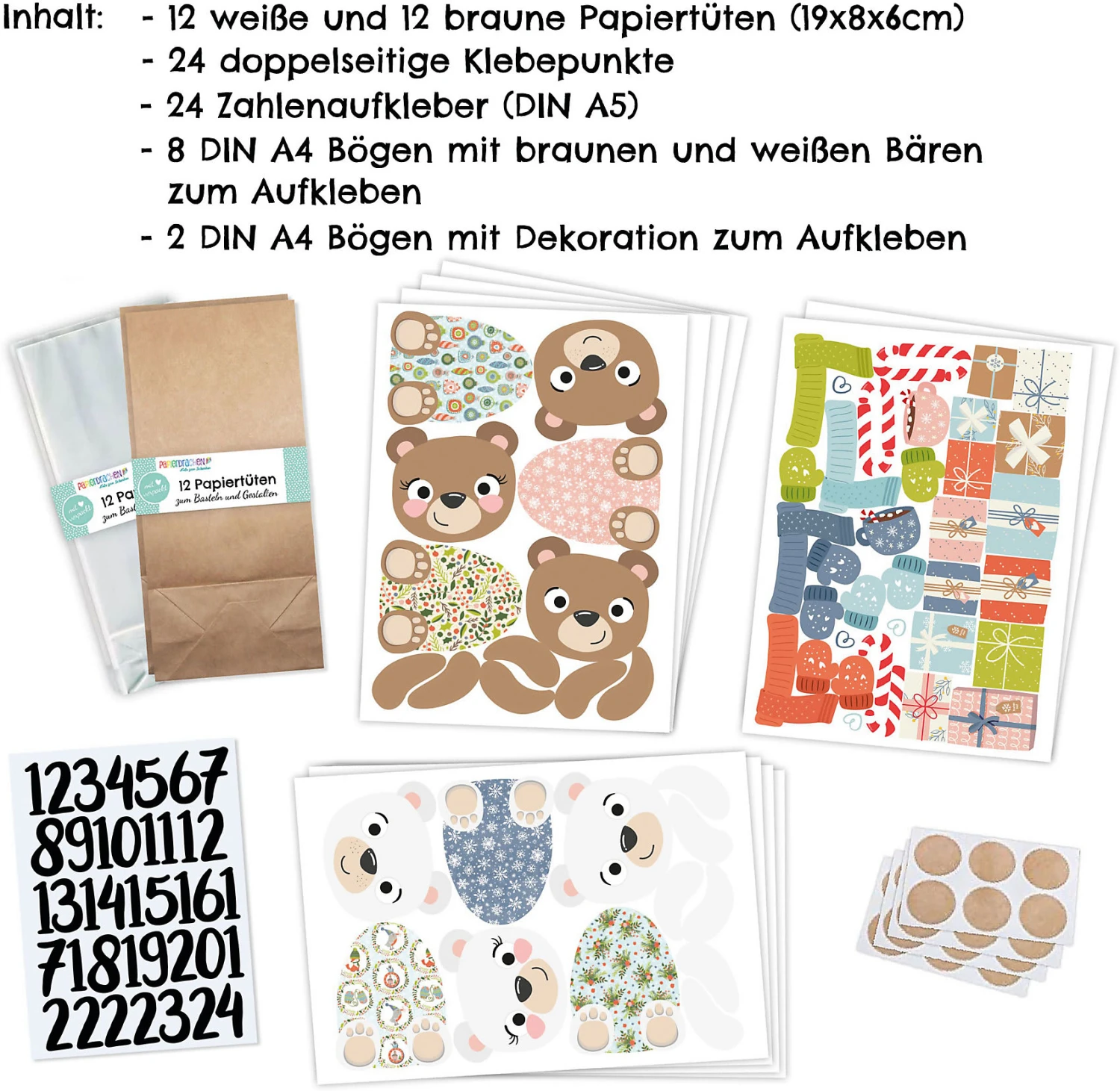 Der Tüten-Adventskalender mit Bären-Motiven wird mit Stickerbögen geliefert, sodass alle Tüten im niedlichen Bären-Look verziert werden können. Außerdem liegen schwarze Zahlenaufkleber mit den Zahlen von 1-24 sowie doppelseitige Klebepunkt zum Verschließen der Tüten bei. Mit diesem DIY-Adventskalender werden Sie viel Spaß haben und Ihren Kindern die Vorweihnachtszeit verschönern.