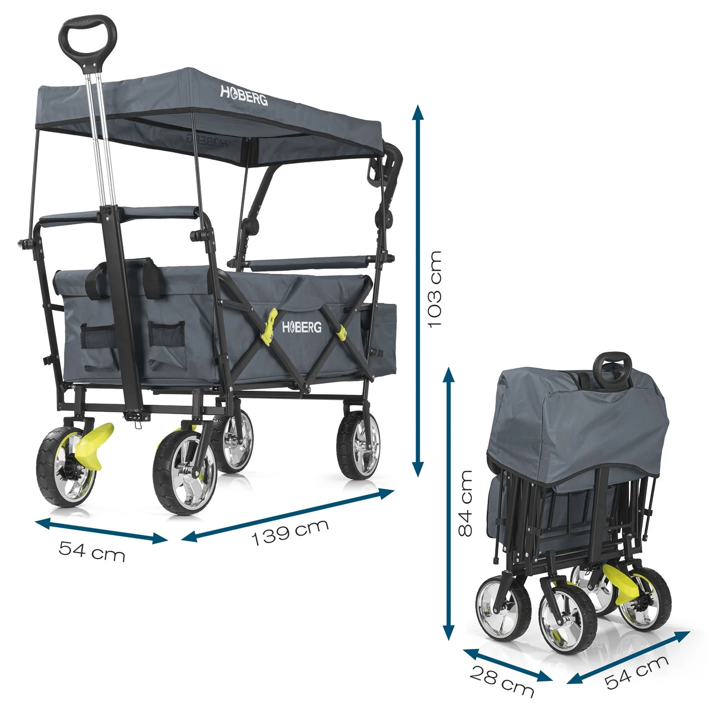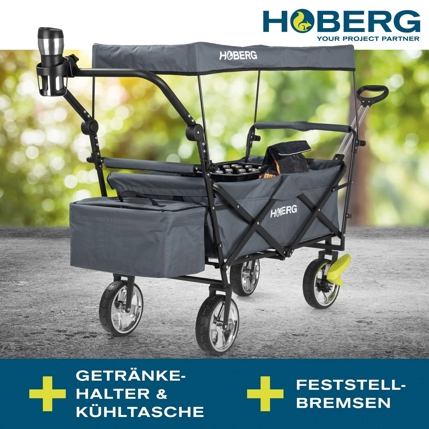 Der faltbare Bollerwagen von Hoberg ist dein idealer Begleiter für alle Ausflüge im Freien und ebenso schnell aufgebaut wie wieder platzsparend verstaut! Dank des stabilen Metallrohrrahmens und des robusten Nylonbezugs lassen sich damit bis zu 80 kg Gewicht transportieren – ideal für die eine oder andere Getränkekiste. Der Dachbezug schützt das Transportgut gleichermaßen vor Regen und Sonne. Die 360°-Drehgelenke an den Rädern machen den Bollerwagen besonders wendig, der ausziehbare Handgriff ermöglicht eine optimale Handhabung und die Feststellbremsen sichern den Wagen vor Wegrollen. Bei hohem Gewicht kann hinten noch mit dem Schiebegriff angeschoben werden. Inklusive Halterung für die dazugehörige Kühltasche. Wird er nicht mehr gebraucht, ist er schnell in der beiliegenden Aufbewahrungstasche verstaut – griffbereit für den nächsten Ausflug.