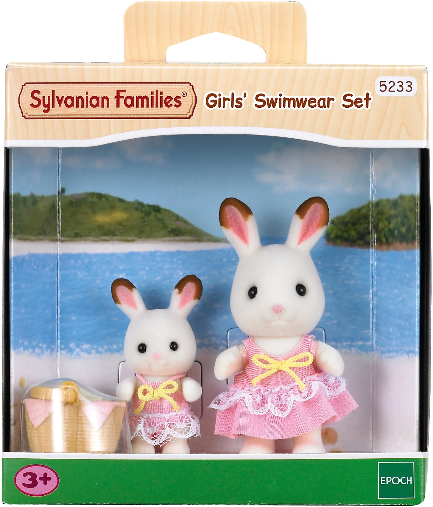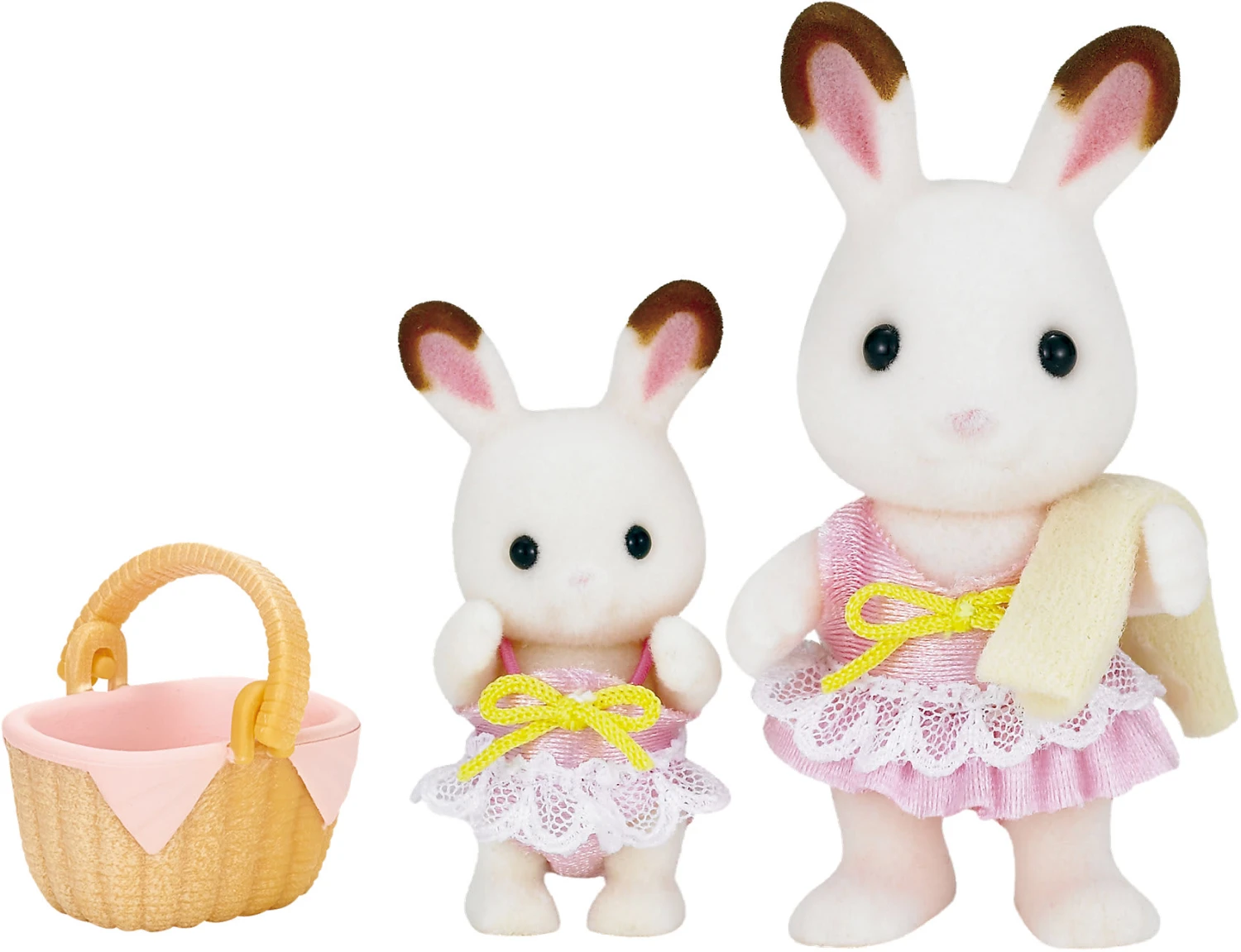 Luna, die Schokoladenhasen-Schwester und Baby Rosi haben sich in ihre schicken rosa Badeanzüge mit hübschem Röckchen geworfen und sind bereit, im Partnerlook plantschen zu gehen. Ein Handtuch und ein Korb sind auch mit dabei, so sind sie für einen herrlichen Tag am Strand bestens ausgerüstet.