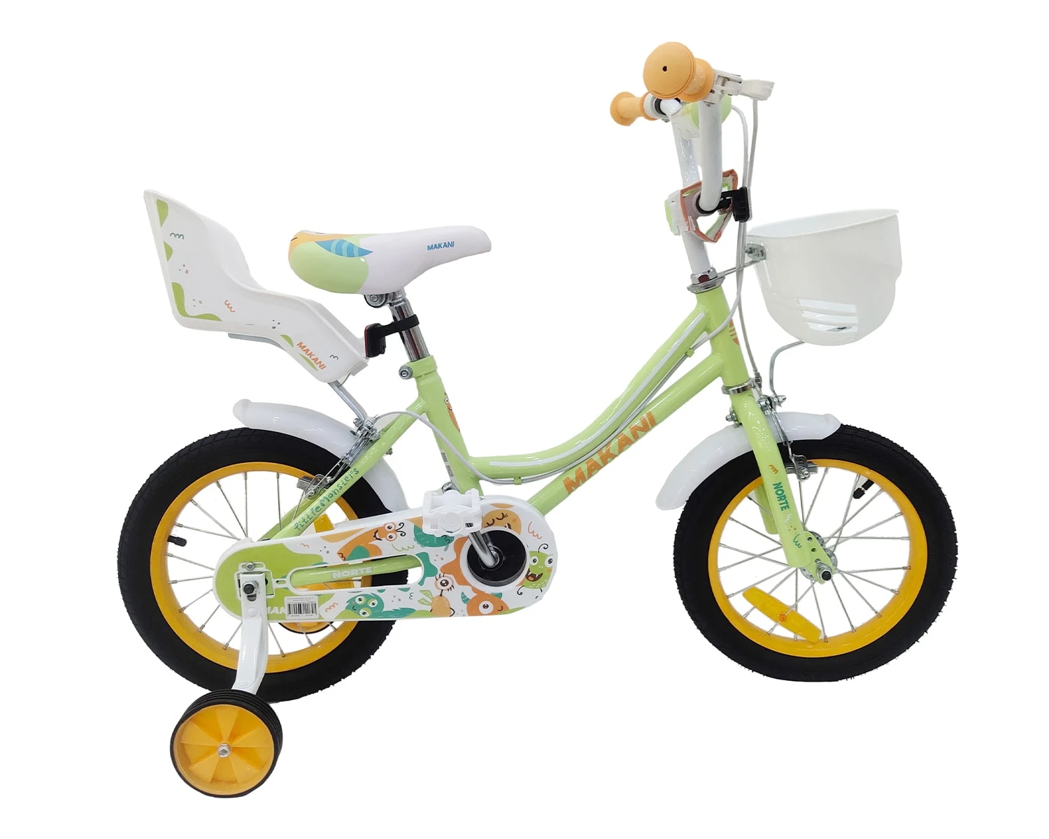 Das Kinderfahrrad 14 Zoll Norte von Makani wird Puppenmamis ab 4 Jahren begeistern. Es verfügt über einen Frontkorb für die Trinkflasche und Zubehör. Die Lieblingspuppe findet Platz im Puppensitz hinter dem Sattel. Falls Ihr Kind noch nicht sicher sein Gleichgewicht halten kann, ist das kein Problem. Passende Stützräder sind im Lieferumfang enthalten und können bei Bedarf problemlos montiert und demontiert werden. Das Fahrrad lässt sich mit V-Bremsen vorne und hinten bremsen, falls Ihr Kind mal zu rasant unterwegs ist. Eine Klingel, Protektoren und ein Kettenschutz sorgen unterwegs für die notwendige Sicherheit.