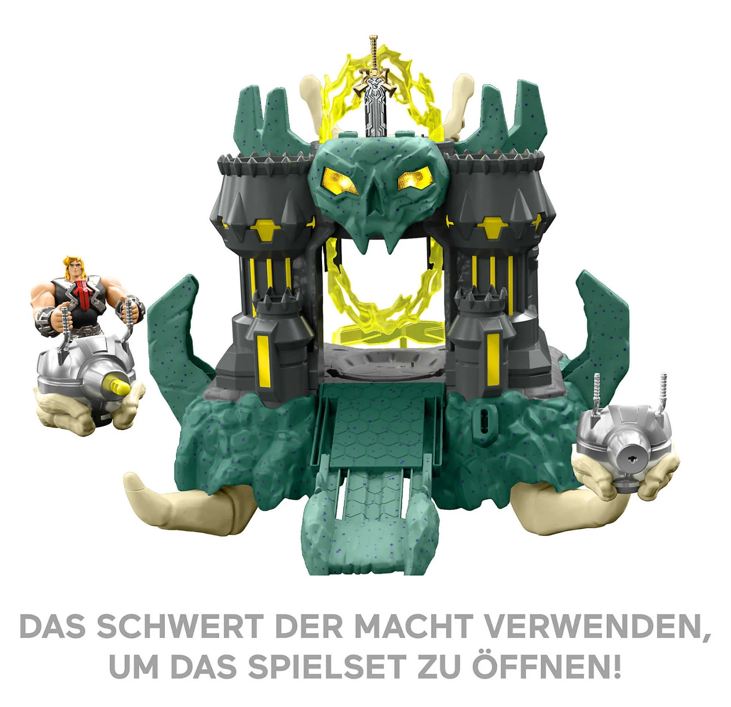 Erobere die einzigartige Masters of the Universe Burg von Mattel. dieses coole Spielst begeistert Kids mit vielen Details, felsenähnliche Elemente und Totenkopf inklusive. Das große Tor ist versperrt, doch das Schwert der macht eilt zur Hilfe und öffent die Barriere. Verteidige das Schloss und feuere Projektile ab. Über zwanzig Licht- und Soundeffekte machen das Spiel zu einem besonderen Erlebnis. Stürze dich in ein aufregendes Abenteuer und lass dir actionreiche Geschichten einfallen, die du hier nachspielen kannst.