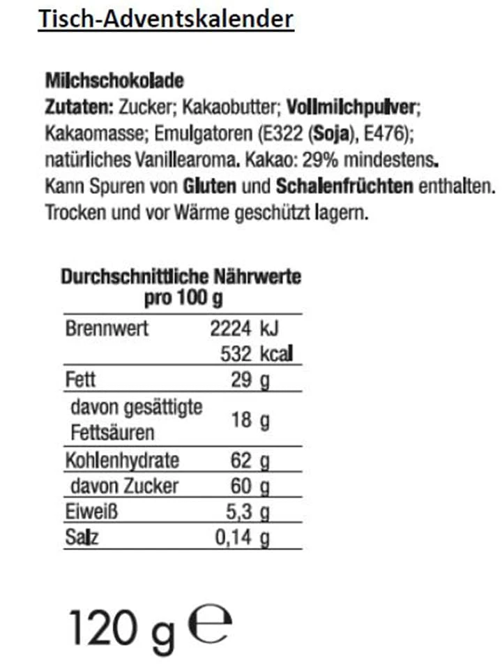 Zutaten: Zucker, Kakaobutter, VOLLMILCHPULVER, Kakaomasse, Emulgatoren (E3222 SOJA, 1476), natürliches Vanillearoma, Kakao: mind. 29%