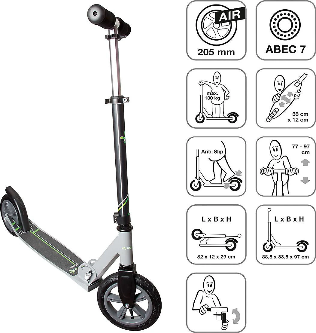 Ein hochwertiger Roller aus Aluminium mit optimiertem Klappmechanismus und tiefergelegtem Deck: der Scooter „Muuwmi AIR“! Damit ist Ihr Kind auf dem Weg zur Schule, zu seinen Freunden oder einfach zum Spaß stets flott unterwegs und hat jede Menge Freude. Die Lenkerhöhe des Rollers ist verstellbar, sodass er von Kindern im Wachstum besonders lange genutzt werden kann und stets eine ergonomische Haltung ermöglicht. Auch zum Mitnehmen eignet der „Muuwmi Air“ sich ideal, denn er lässt sich kinderleicht und kompakt zusammenklappen.