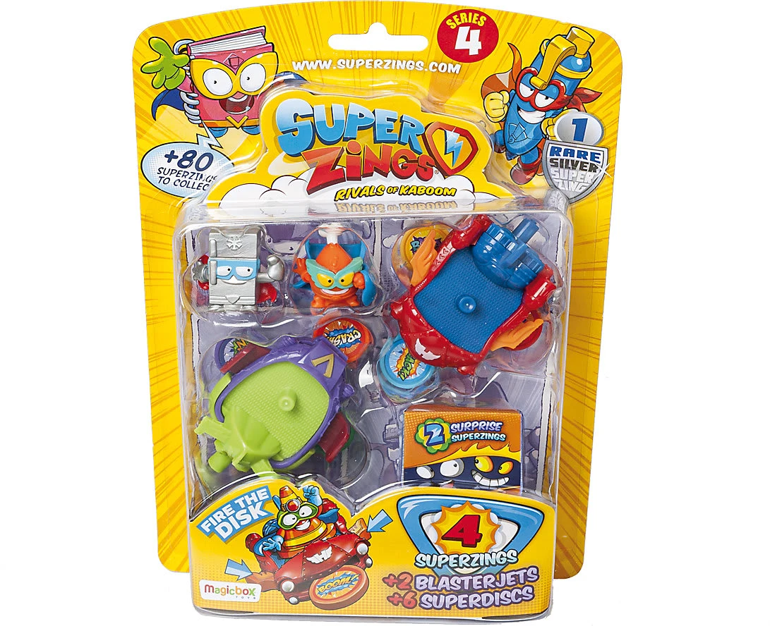 In der „SuperZings 4“-Serie von ASS gibt es nun dieses coole „Blister BlasterJet“-Set! Die coolen Sammelfiguren aus Kaboom City gibt es nun in achzig verschiedenen Varianten, unter anderem seltene, super seltene und den mysteriösen Kid Kazoom. Hier sind gleich vier davon dabei sowie zwei Blasterjets und sechs Discs.